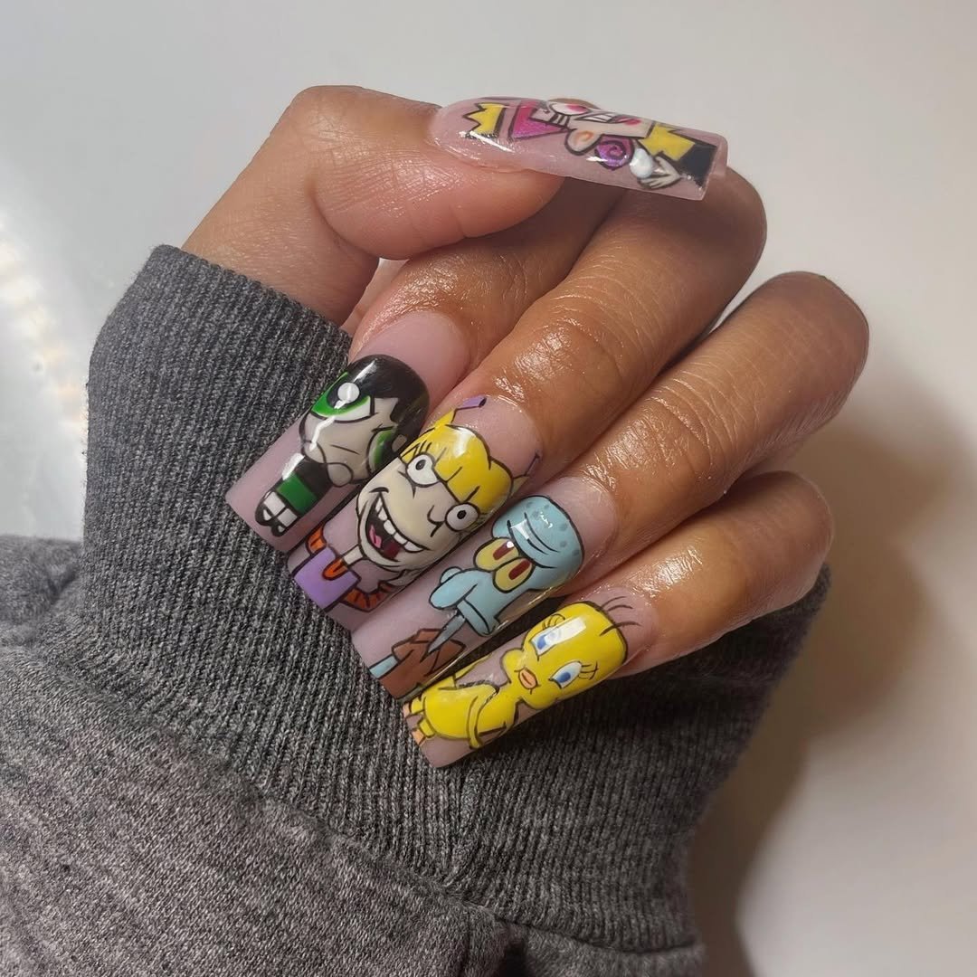 Long square tips fully dedicated to iconic characters? Commitment level: elite. Each nail is practically a poster, and the detailing is so crisp it feels printed.