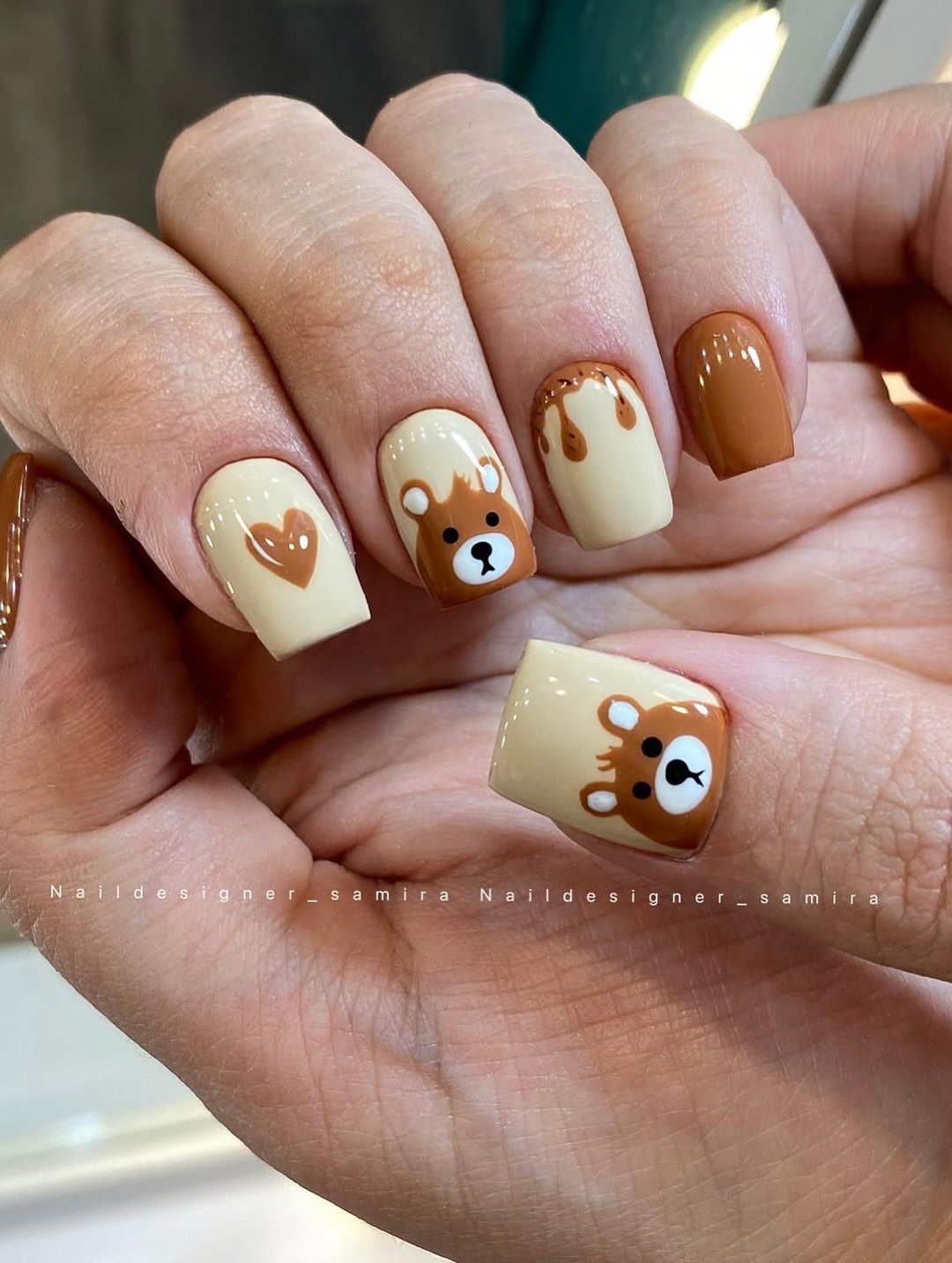 Soft beige tones + the cutest little bear faces = instant comfort nails. The color palette is warm and creamy, making the cartoon details feel calm instead of loud.