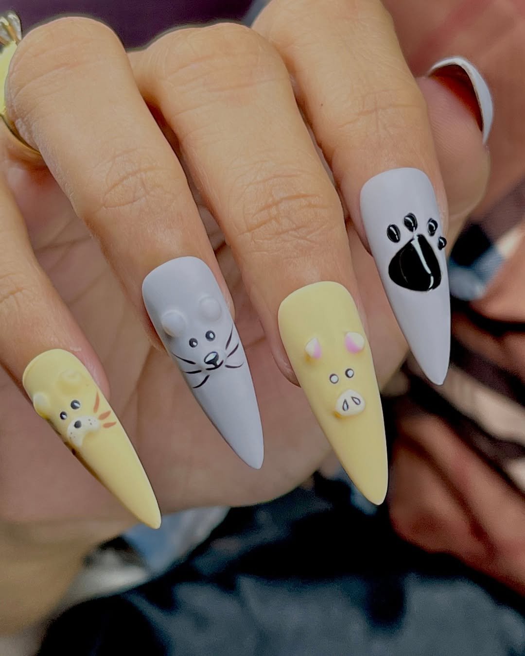 These pointed tips feature tiny animal faces with subtle 3D details that make everything feel extra sweet. The muted yellow and grey palette keeps it soft and approachable.