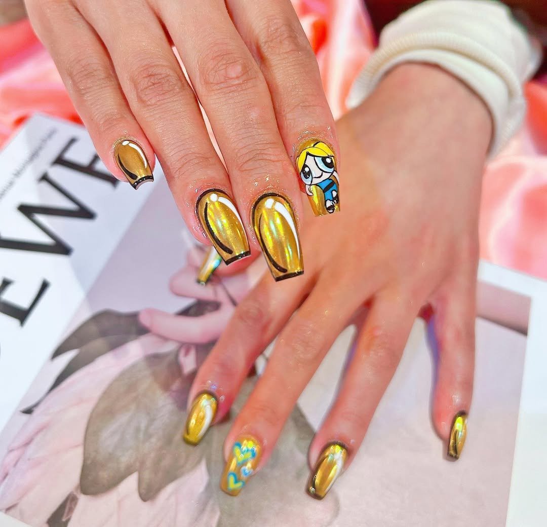 Chrome gold meets cartoon charm, and honestly? It works. That little Powerpuff accent adds just enough sweetness to balance out the high-shine metallic drama.