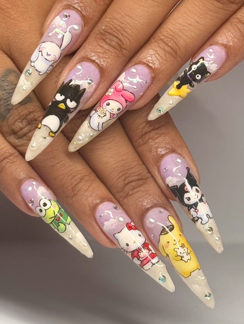 These pastel stiletto tips feel like opening a sticker book from your childhood — but make it luxury. Every nail brings a different character to life, layered with pearls and soft shimmer that somehow keeps all the chaos looking cohesive.