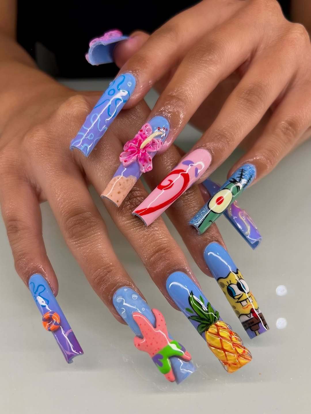 These extra-long tips go full cartoon universe mode. Between SpongeBob energy, bold colors, and 3D accents, every nail demands attention.