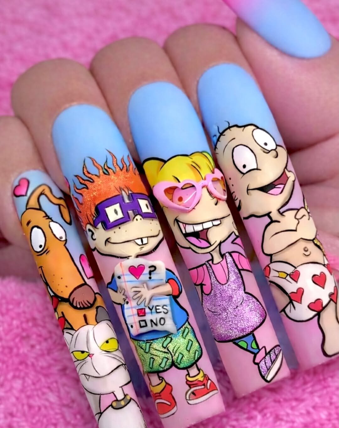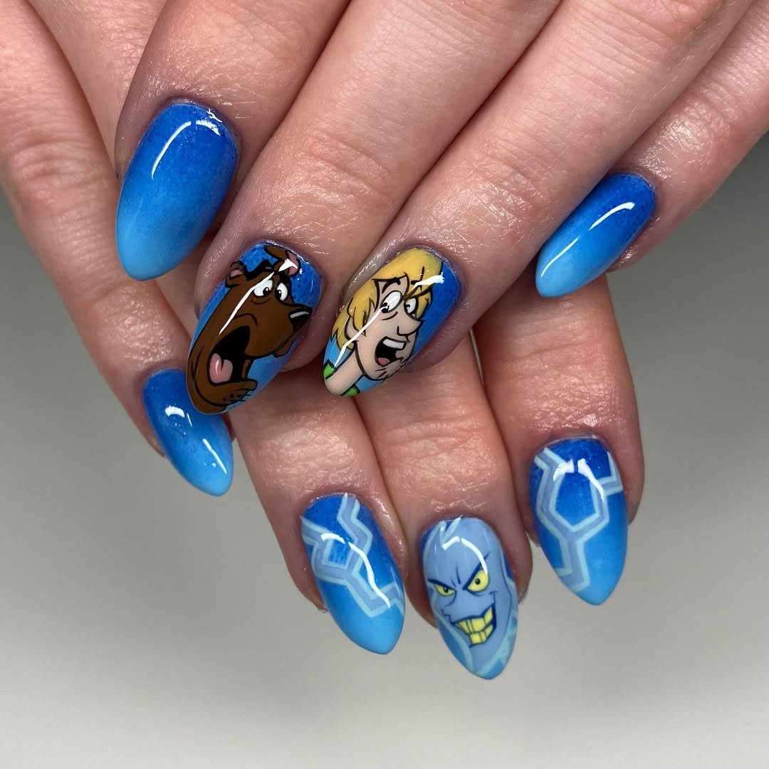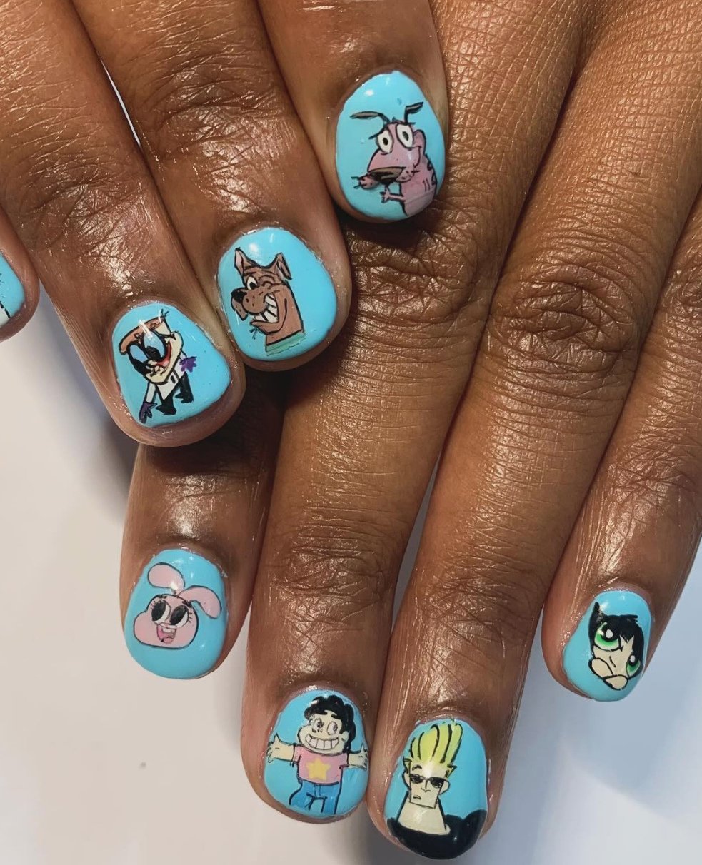 Bright blue bases with classic cartoon faces bring serious nostalgia here. The character placement feels intentional, balanced out by clean surrounding nails.