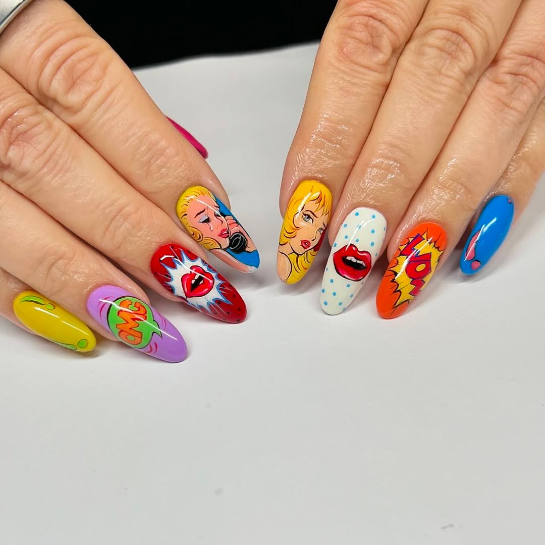 Bright blocks of color outlined in black bring serious comic-book vibes. Each nail feels graphic, punchy, and intentionally imperfect in that artsy way.