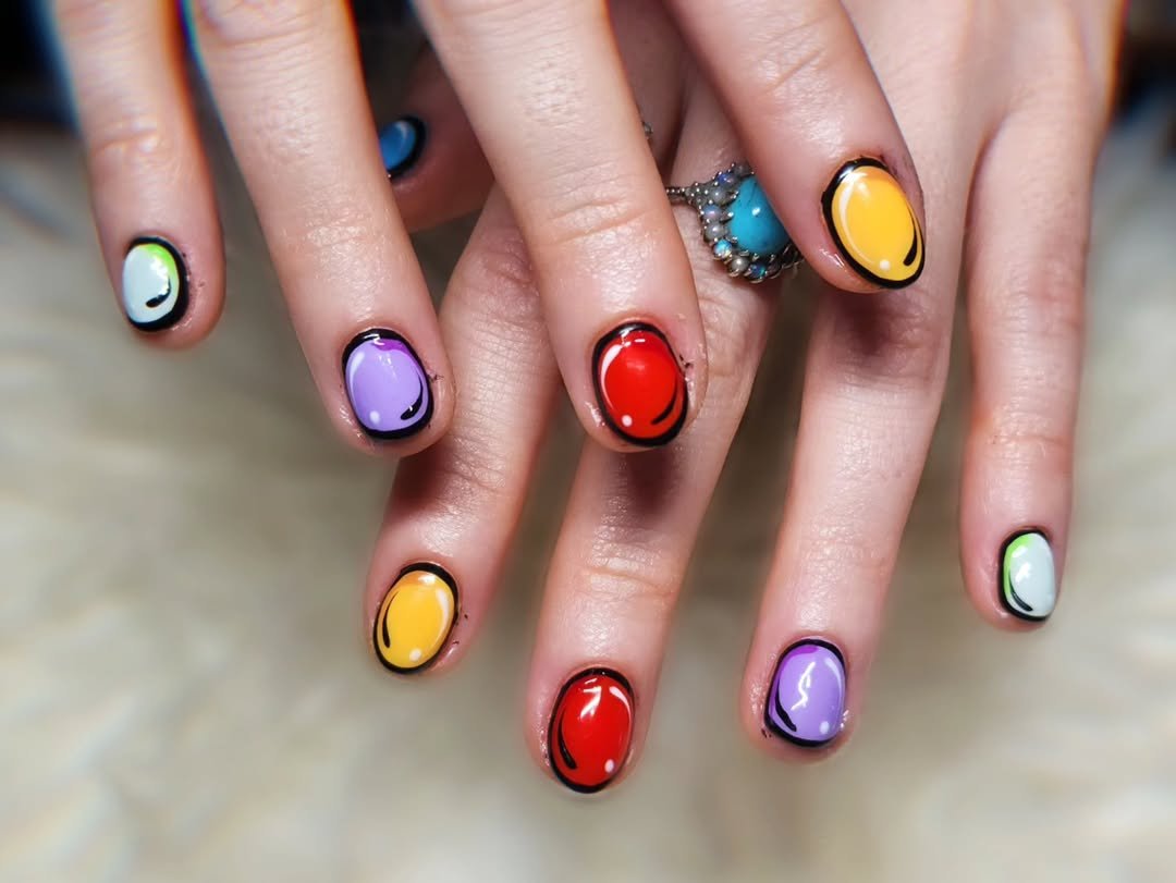 These short nails prove you don’t need length to bring the drama. From goofy faces to bright donut accents, every finger feels like its own mini episode. The glossy finish ties everything together so it still feels polished, not messy.