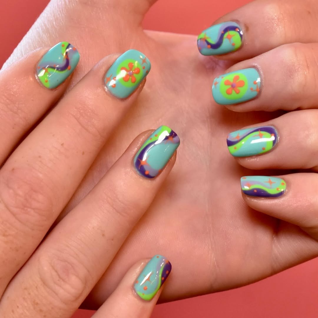 Turquoise bases, wavy purple lines, tiny orange sparkles — it’s giving vintage cartoon intro vibes. The color combo is unexpected but somehow perfectly balanced.