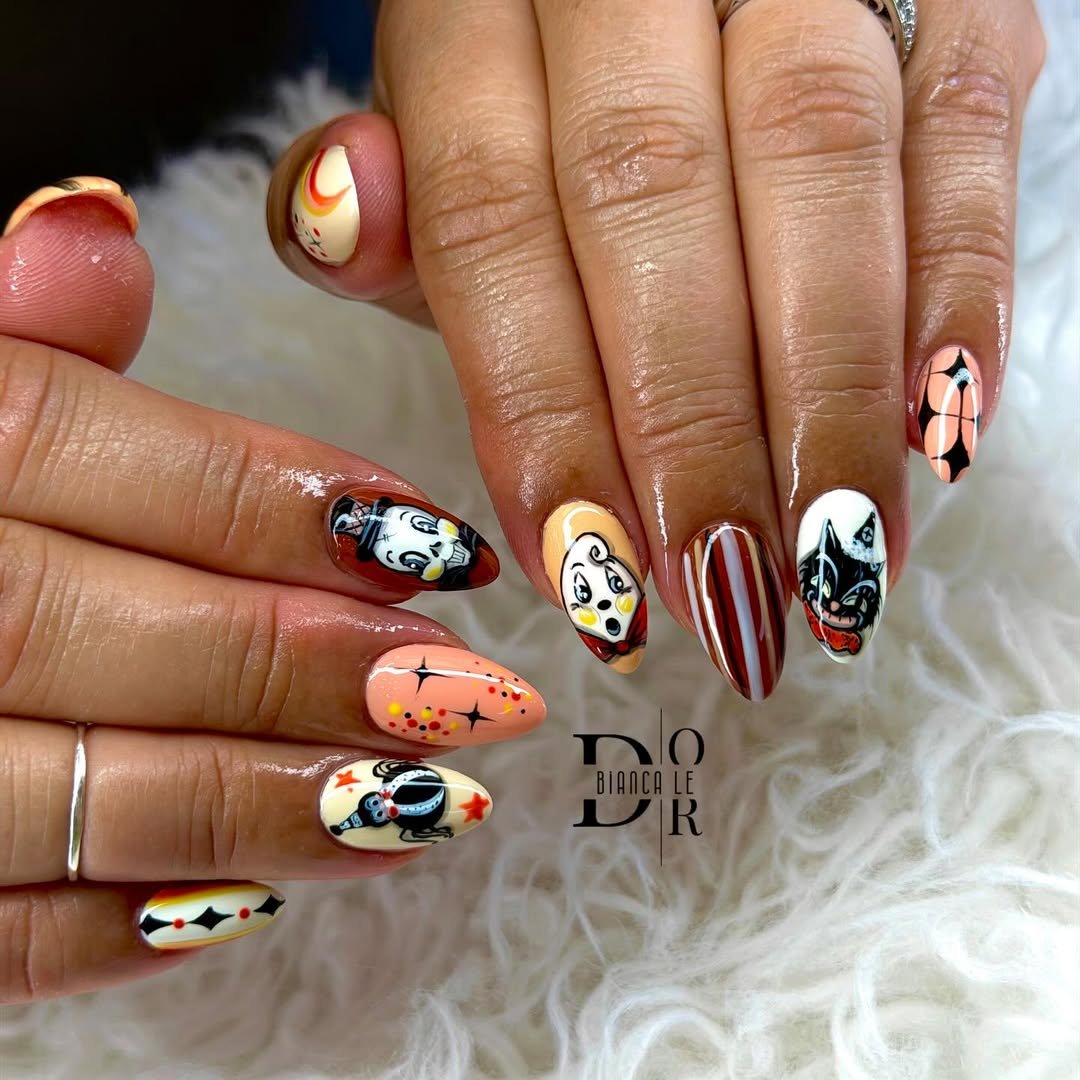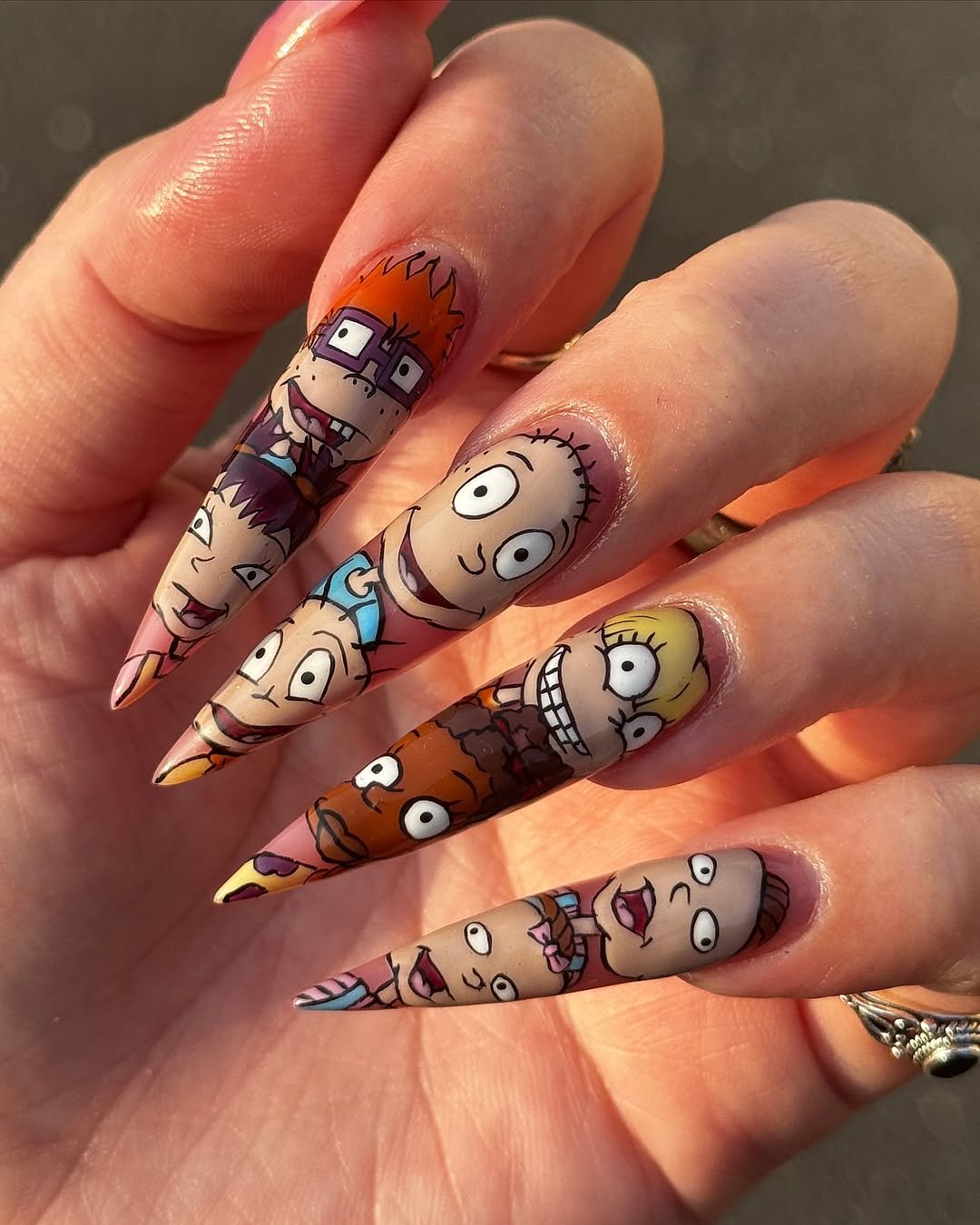 This one is pure nostalgia fuel. Hand-painted cartoon faces stretched across long stilettos? Risky. Pulled off flawlessly? Absolutely. Every character feels alive, right down to those exaggerated expressions.