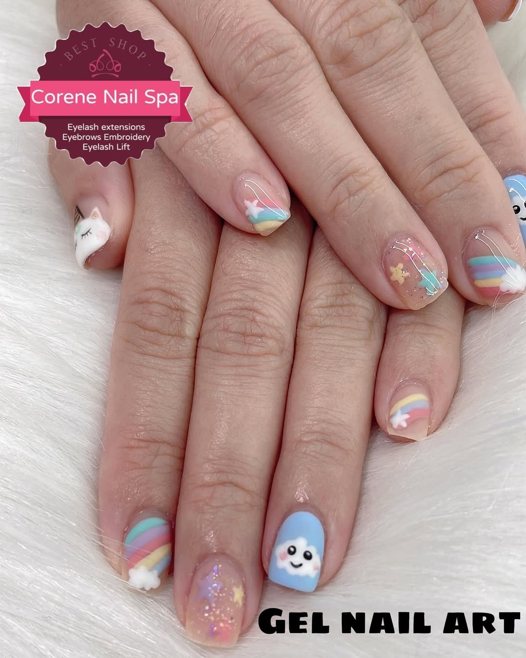 Shorter nails, gentler colors, and the sweetest cloud details — this one feels like a warm hug. The translucent pastels and tiny rainbows keep things light and wearable.
