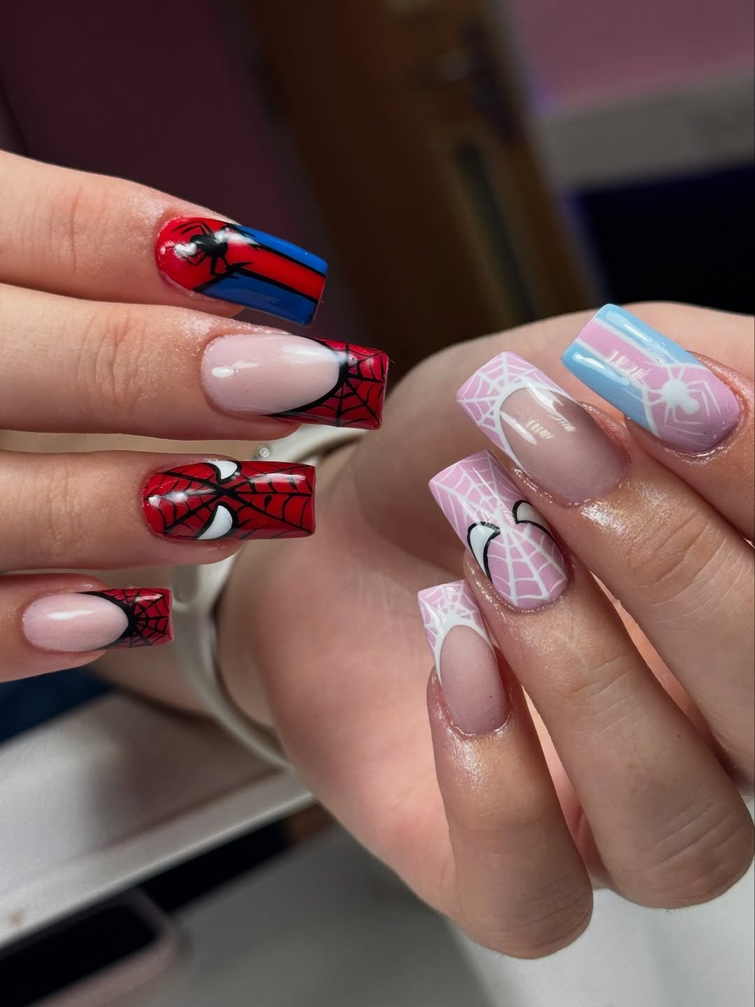 Half red, half pastel, all attitude. This dual Spider-Man moment plays with contrast in the best way — bold webs on one hand, soft pinks on the other, tied together with clean linework.