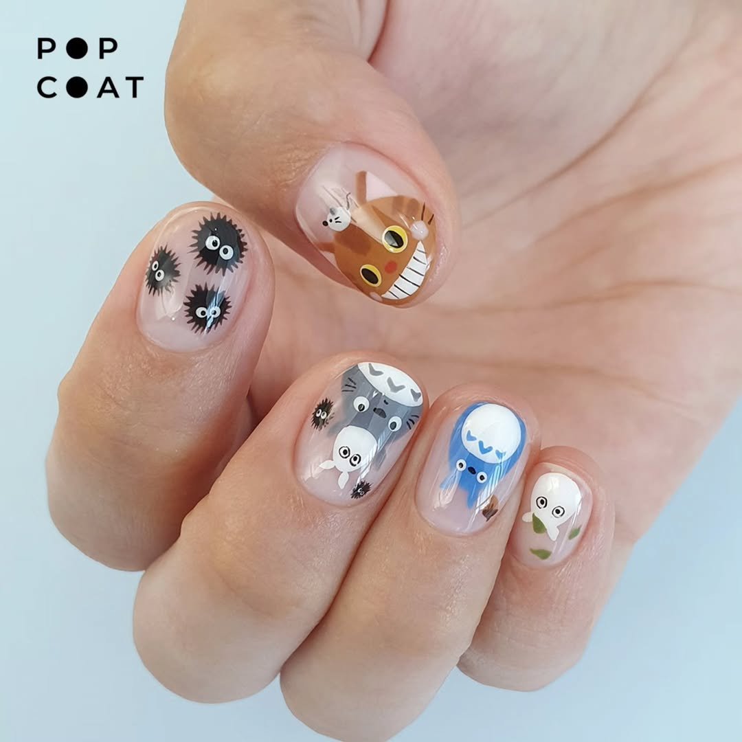 These short, translucent nails feel delicate and dreamy. From soot sprites to Totoro, every tiny character looks like it was placed with care instead of chaos.