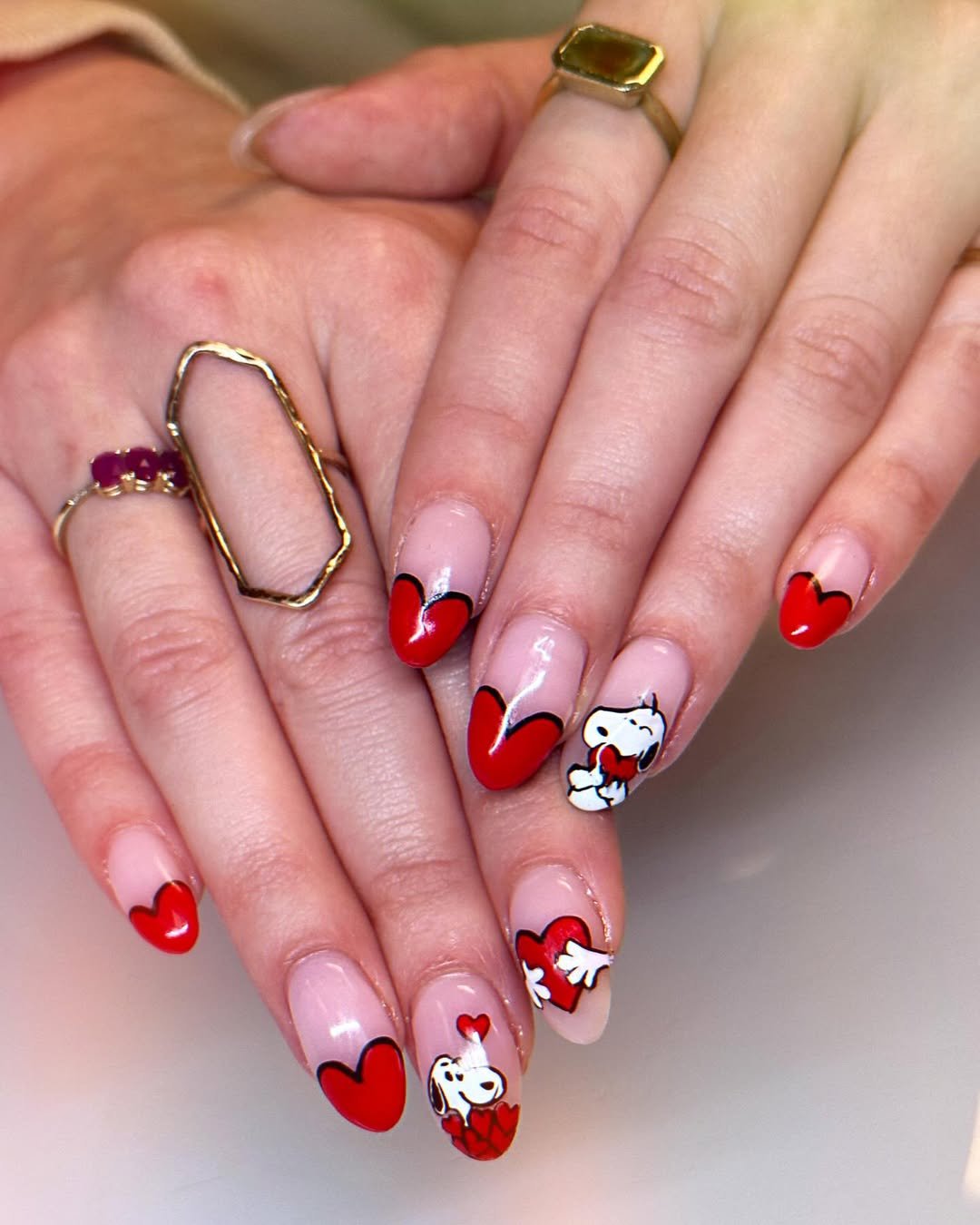 Red hearts on a soft nude base already had main-character potential — and then Snoopy shows up holding love like it’s his full-time job. The glossy finish makes the red pop without overpowering the simplicity.