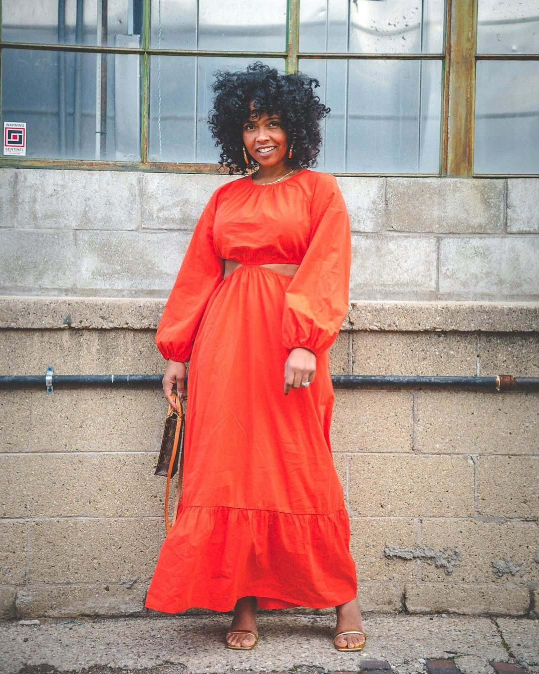 This tangerine dress is pure joy — bold, bright, and full of that voluminous, airy movement that makes every step feel dramatic in the best way. The sleeves add a bit of whimsy, while the tiered skirt gives it a soft, romantic flow.