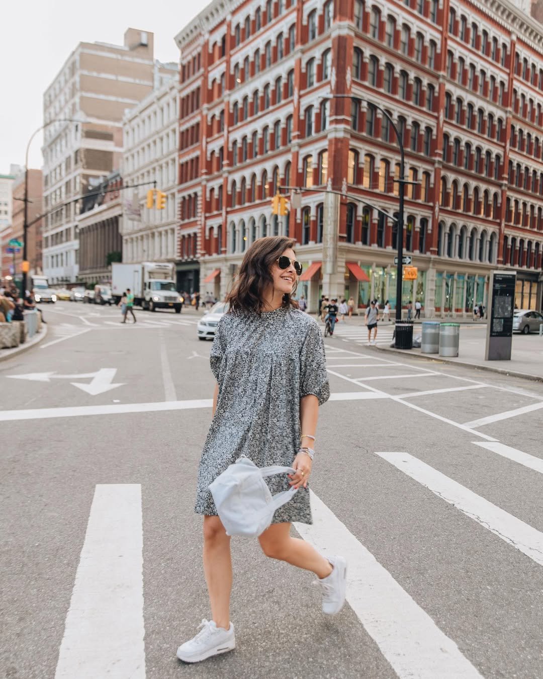 The white accessories keep the palette light and breezy, while the sneakers make the whole vibe casual and moveable. It’s the perfect reminder that pretty dresses aren’t just for picnics — they belong in crosswalks too.