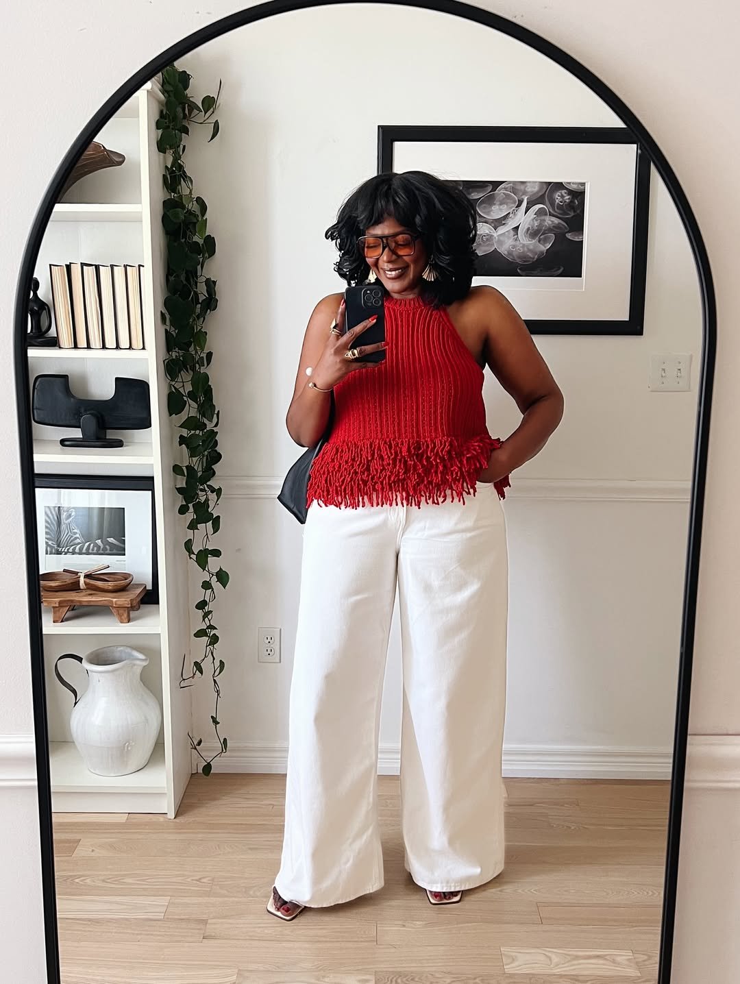 This red halter is pure texture heaven — bold fringe, ribbed knit, and that flattering neckline all working together to create an outfit that’s fun, flirty, and full of movement. It’s the type of top that instantly energizes your day.