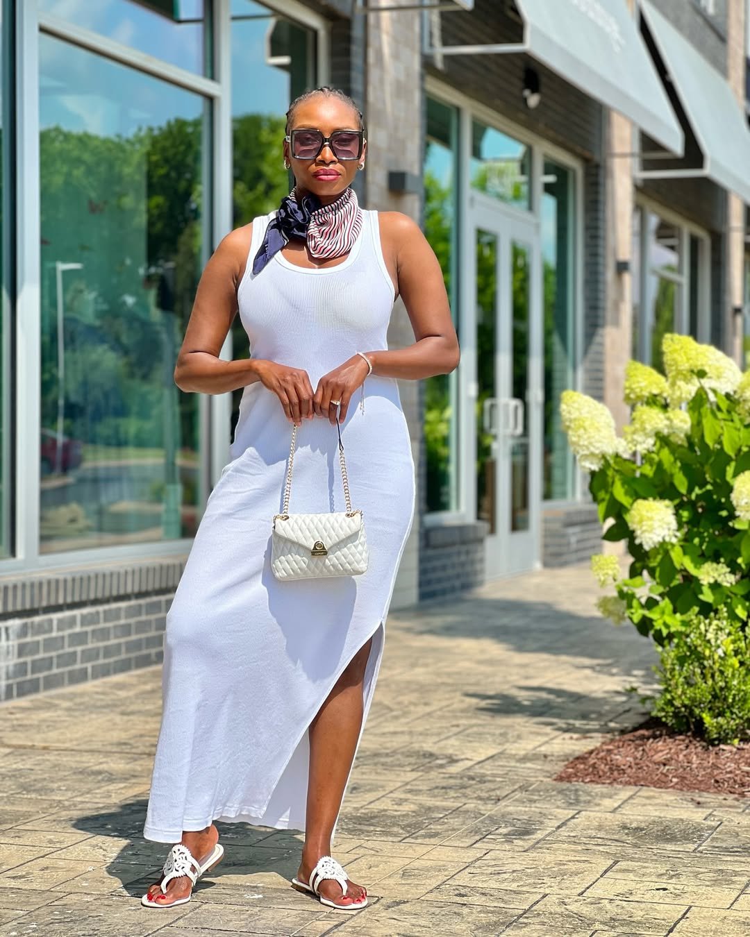 A white knit maxi just feels like sunshine — clean, simple, and beautifully timeless. The side slit adds a touch of ease, giving the dress that breezy movement perfect for warm days. It’s the kind of piece you throw on and instantly feel put together in.