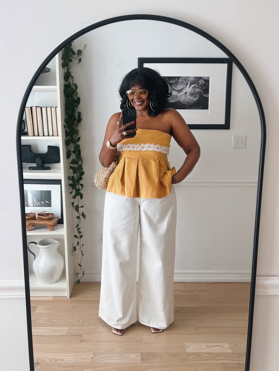 This strapless mustard top with its blooming silhouette is such a standout moment — soft pleats, embroidered detailing, and that gentle flare that feels both artistic and polished. It brings sunshine indoors, effortlessly.