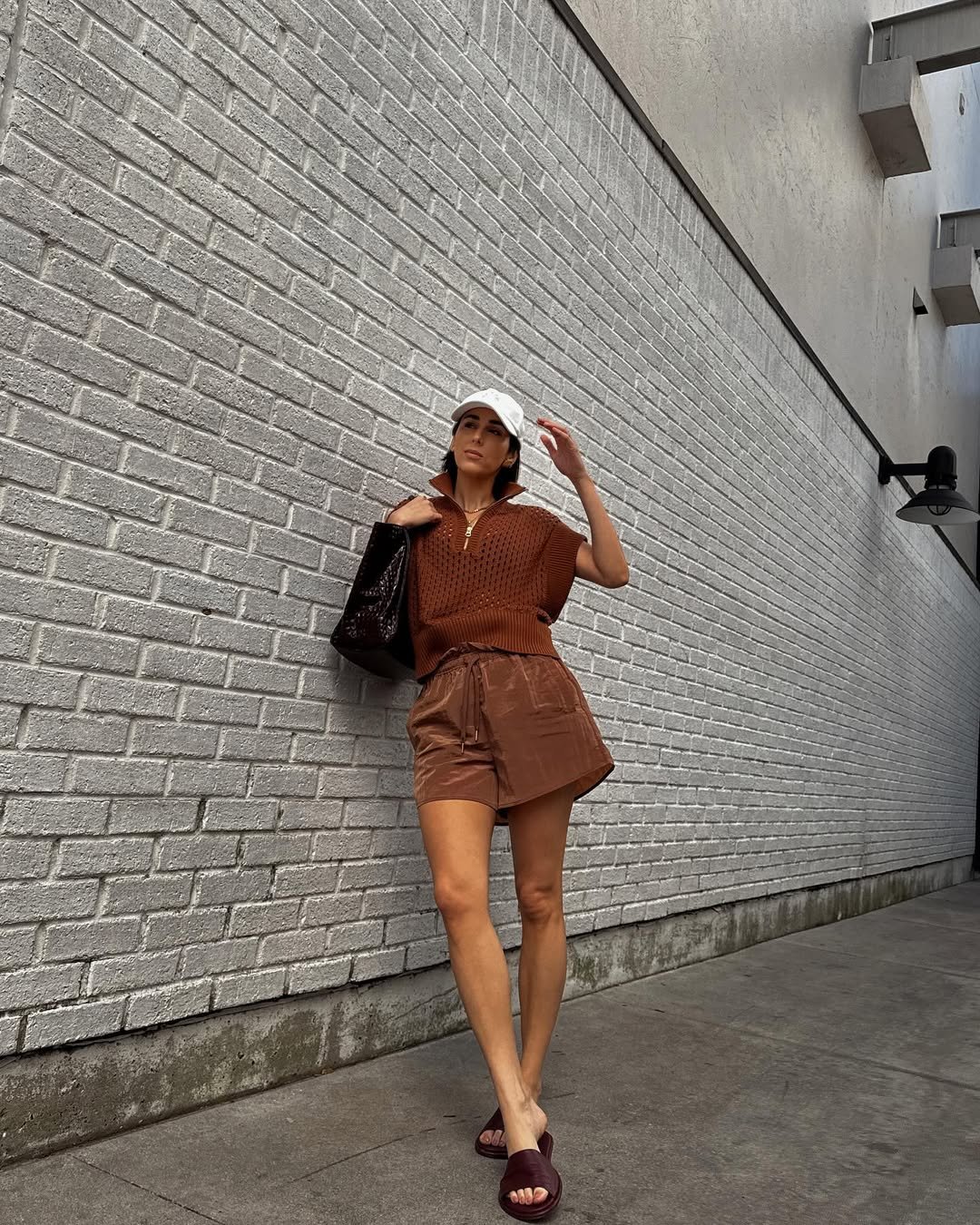The baseball cap adds a sporty twist, pulling the look into everyday territory without breaking the monochrome magic. And those deep, chocolatey slides? They feel intentionally unfussy, grounding the outfit in that “cool girl running afternoon errands” energy.