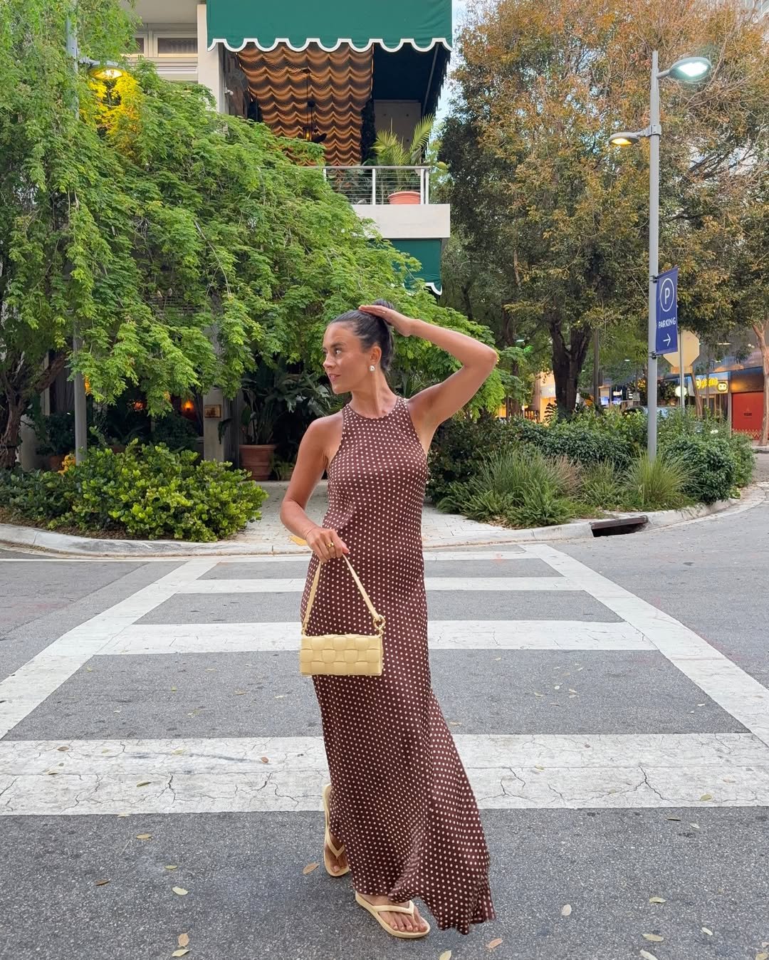 The easy sandals and small crossbody bag add a touch of casual refinement. It’s the kind of outfit you reach for when you want to feel comfortable but still utterly pretty, ready for strolls, iced drinks, and sunsets.