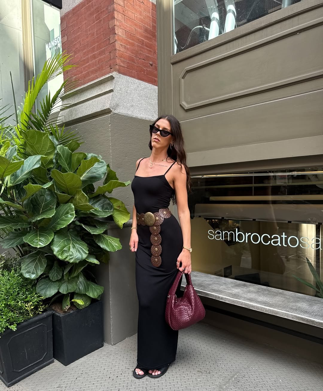This long black dress feels sleek and sculptural — almost statuesque — especially with that beautifully detailed belt cinching the waist. It’s simple at first glance, but look closer and you notice the quiet drama: the minimal straps, the fitted silhouette, the deep burgundy bag adding mood.