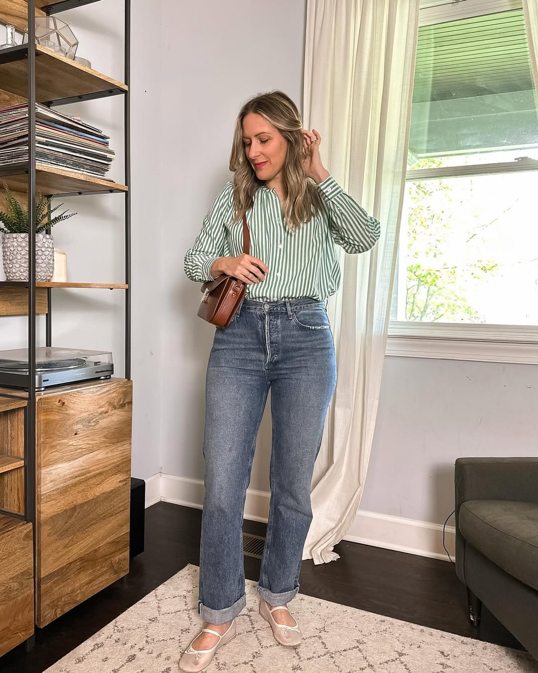 A striped button-down and denim is one of those combos that just works, and Michelle styles it with that perfect “relaxed but intentional” touch. The green stripes feel fresh and cheerful, almost like morning sunlight through a kitchen window. It’s elevated everyday dressing at its finest.