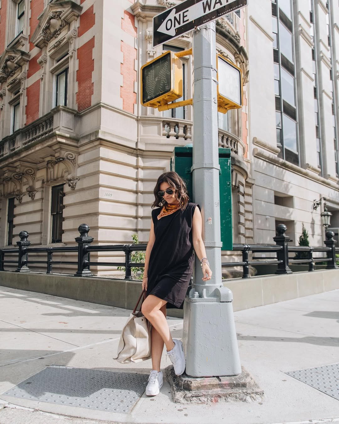 A black tank dress is the city-girl staple that never quits, and this one is styled with that perfect blend of simplicity and polish. The dress is clean and unfussy, but add a bold scarf and a roomy tote and suddenly it becomes an understated street-style moment.