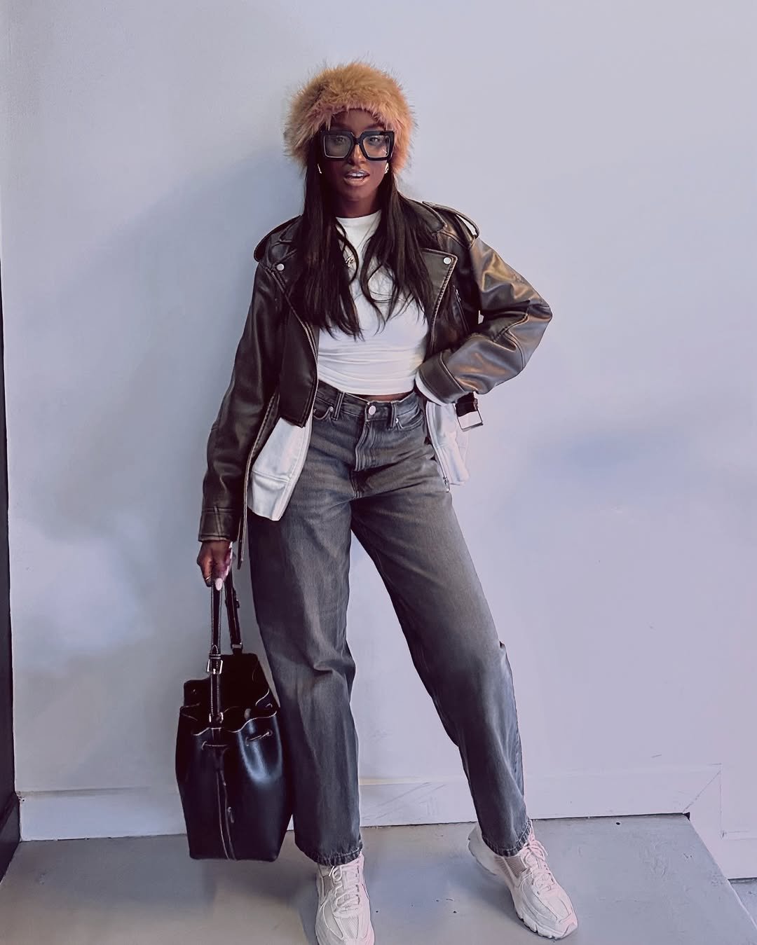 This look is street-style gold — layered, cozy, and bursting with personality. The cropped white top peeks out from under a tough leather jacket, giving the outfit that perfect blend of softness and edge.