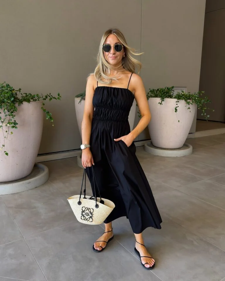 Nothing beats a black sundress for easy, timeless style — and this one has that breezy, cinched detail that flatters without trying. The minimalist sandals keep the look grounded, while the basket bag adds a whisper of vacation charm.