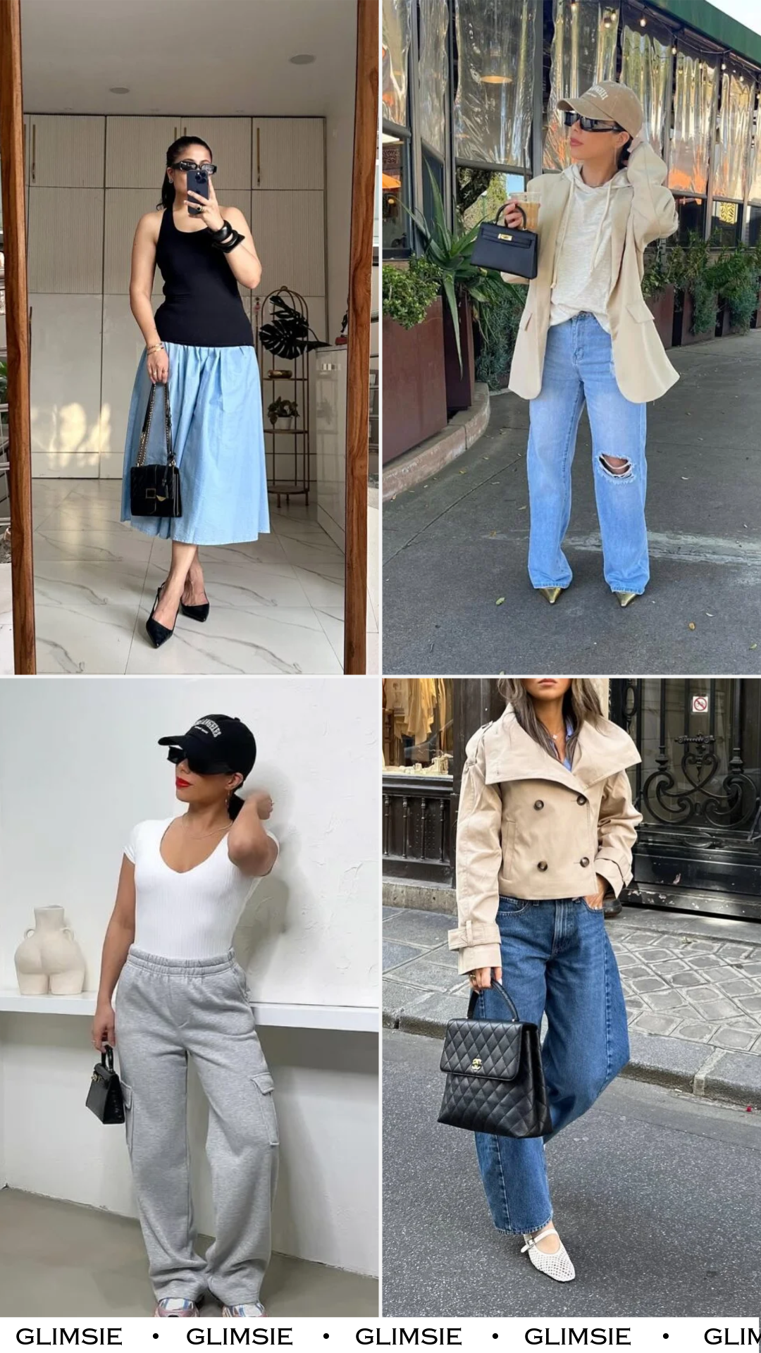 A fitted ribbed tee tucked into relaxed cargo sweats is such a modern take on athleisure — sporty but refined, casual but undeniably intentional. The baseball cap and micro-bag lend a tiny punch of personality, while the fresh sneakers keep everything crisp.