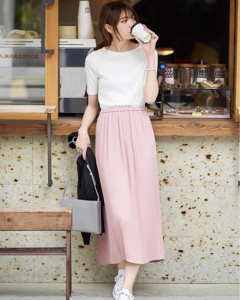 This soft pairing of a white top with a blush pleated skirt feels like springtime in outfit form. It’s airy, feminine, and unfussy — perfect for casual dates, coffee stops, or wandering through your favorite weekend spots.