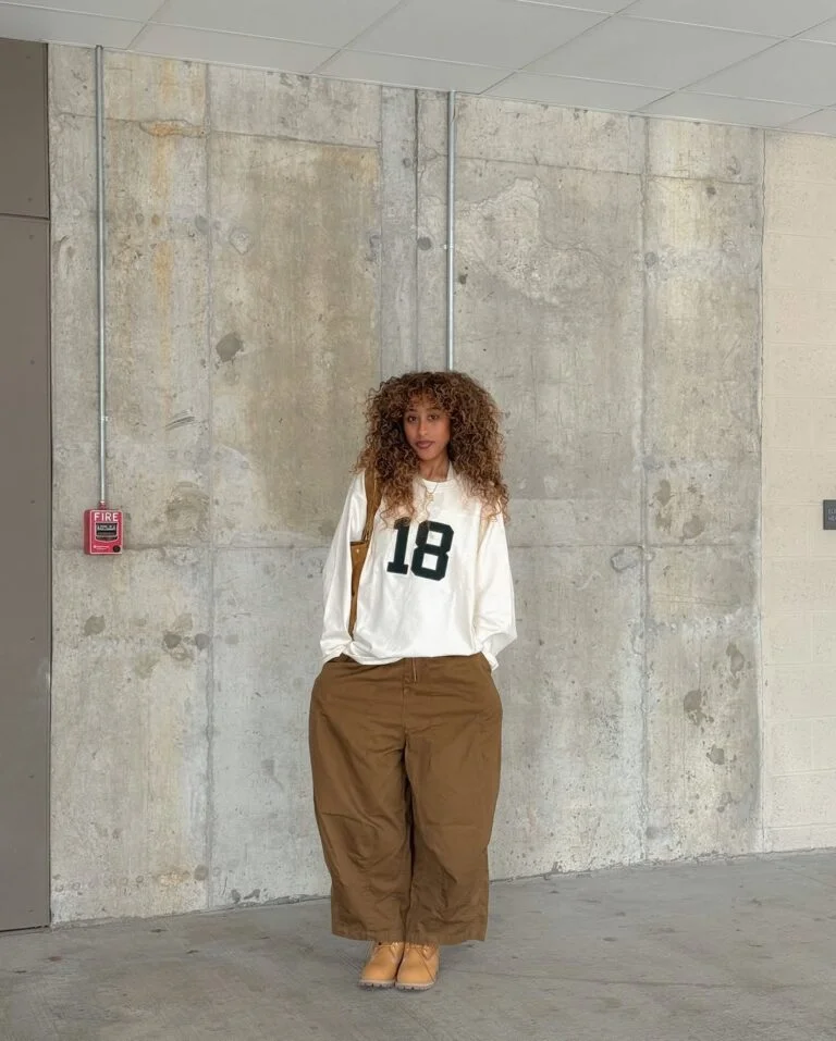 Oversized khaki trousers and a varsity-style top? It’s giving relaxed, creative, off-duty energy in the best way. The earthy palette keeps everything cohesive, while the roomy silhouette brings that intentionally slouchy, street-leaning vibe.
