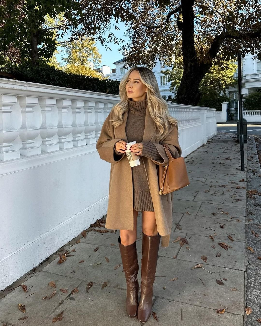 This outfit feels like the warm embrace of fall — rich knits, buttery camel layers, and knee-high boots that bring the whole palette to life. The mix of tones creates that monochrome magic where everything blends seamlessly, yet still feels dimensional.