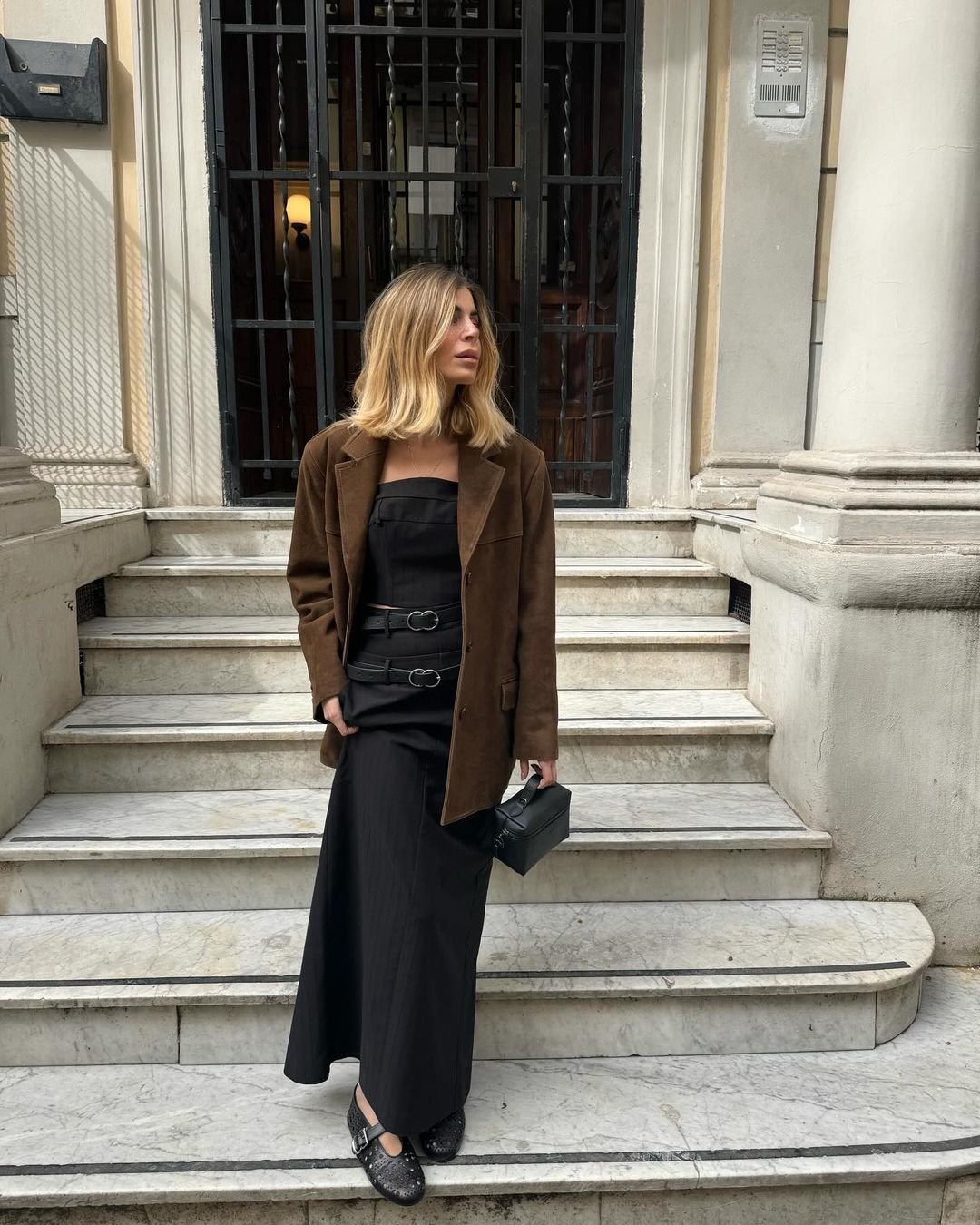 A long black dress becomes instantly more interesting when paired with a chocolate-brown jacket — the contrast of tones adding depth and intention. The double-belt detail is such a modern twist, giving shape without disturbing the minimalist vibe.