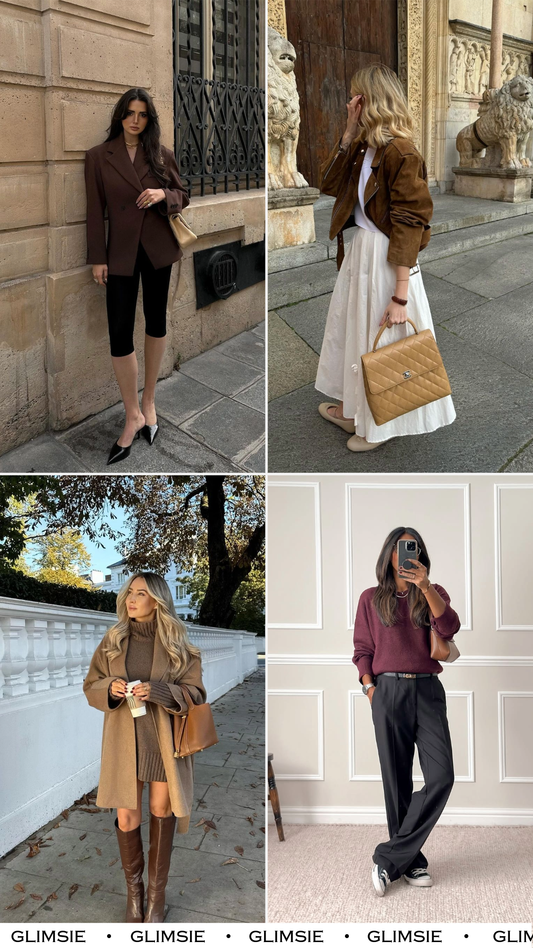 A rich chocolate blazer paired with sleek black cycling shorts creates the kind of modern minimalism that feels distinctly Parisian. It’s casual, yes, but elevated by shape — those padded shoulders adding quiet power, while the pointed heels keep the whole look refined.