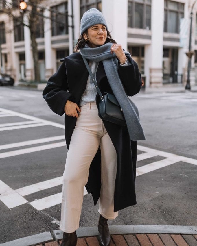A morning-coffee, soft-scarf, brisk-air kind of outfit. The pale denim, icy knit, and deep navy coat create such a calming palette — like winter muted every color just enough to make it feel chic. The little beanie tie-in is chef’s kiss.