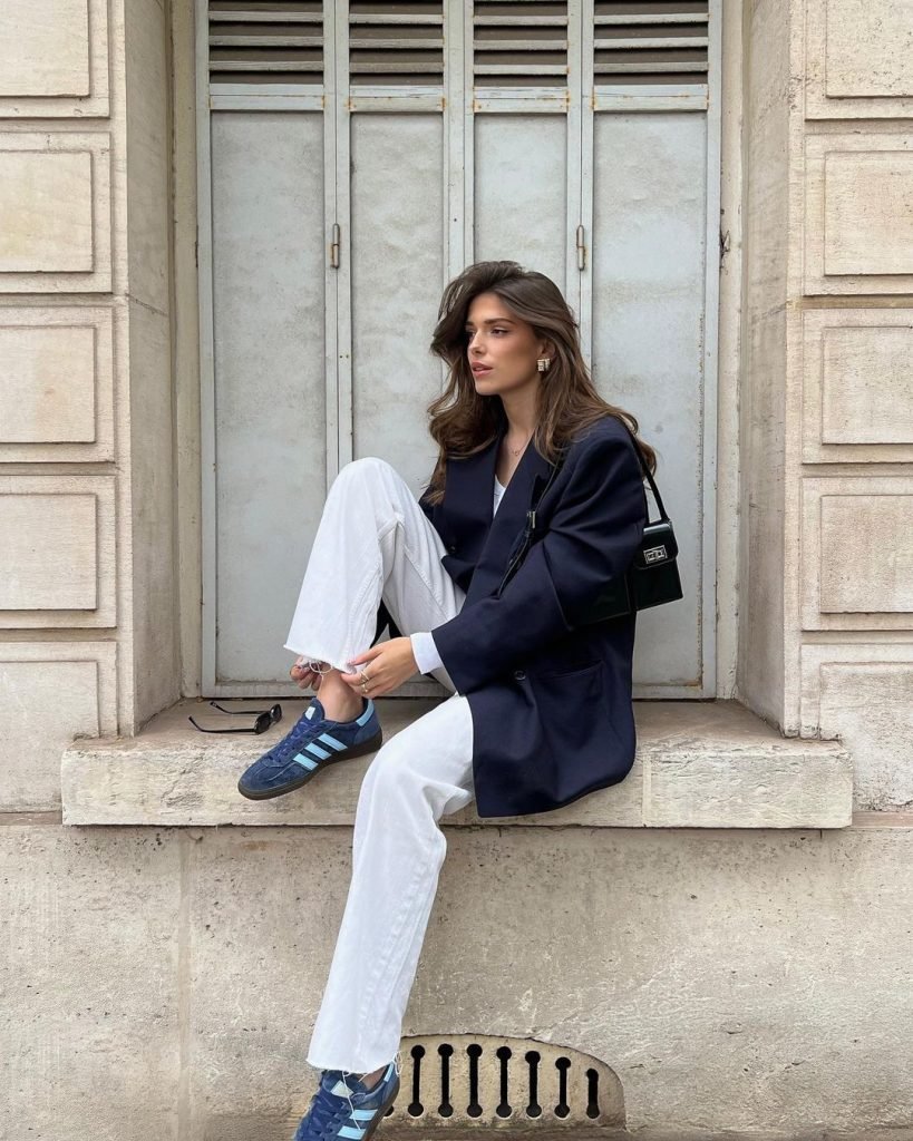 White denim and navy sneakers shouldn’t look this chic together, and yet here we are — the magic of a perfectly oversized blazer at work. The look feels like a love letter to effortless Paris dressing: sporty touches grounded by elegant tailoring.