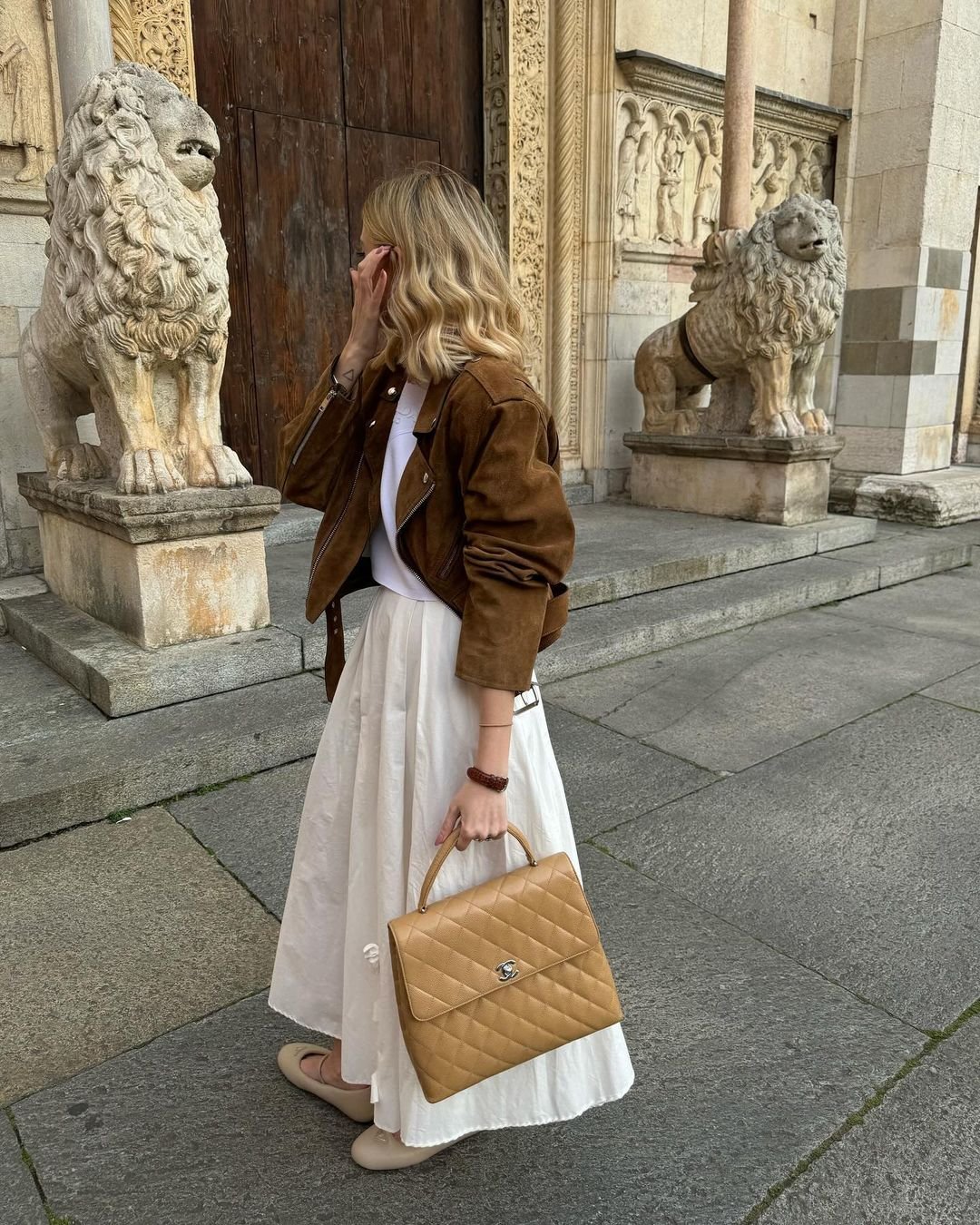 There’s something wonderfully romantic about a full cream skirt drifting through an old stone setting. Paired with a rich brown suede jacket and a quilted bag to match, it feels warm, grounded, and quietly elegant.