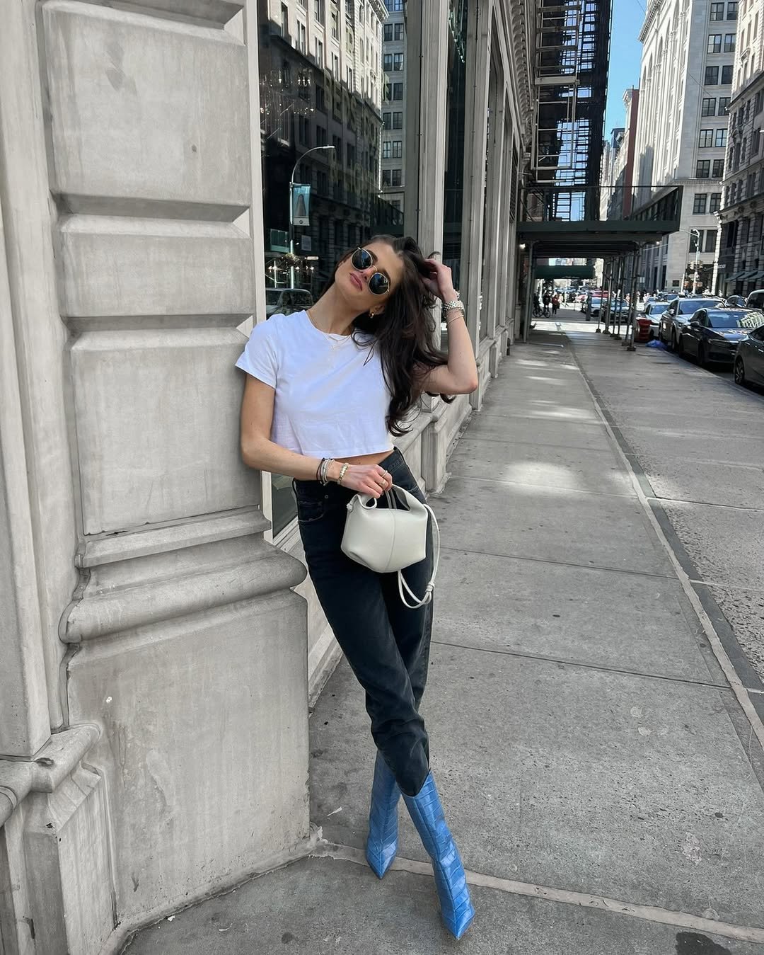 Her little ivory bag softens the contrast, and the mirrored sunnies give it that “NYC weekend wandering” vibe. It’s casual in the coolest, most elevated way.