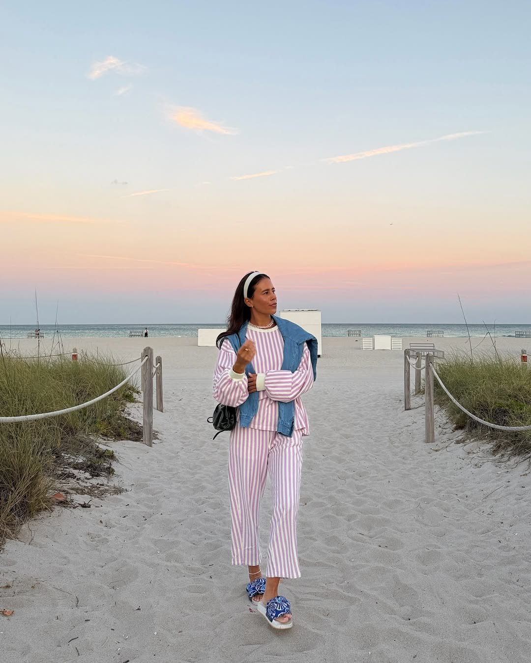 Pink and white stripes at sunset just hit differently. The relaxed set layered with a denim piece over the shoulders feels coastal, easy, and totally unfussy. Add in the statement slides and you’ve got spring break energy without the chaos.