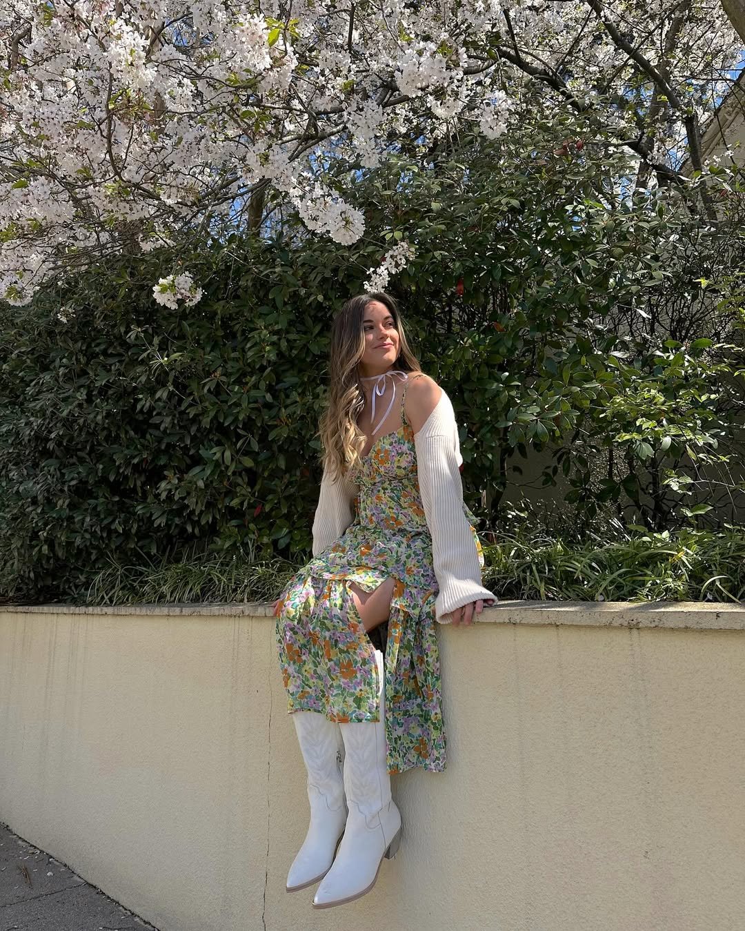 Florals for spring—but make them cool. The flowy floral dress paired with white cowboy boots gives this look just enough edge to avoid feeling too sweet. The slouchy cardigan draped over the shoulders seals the deal.