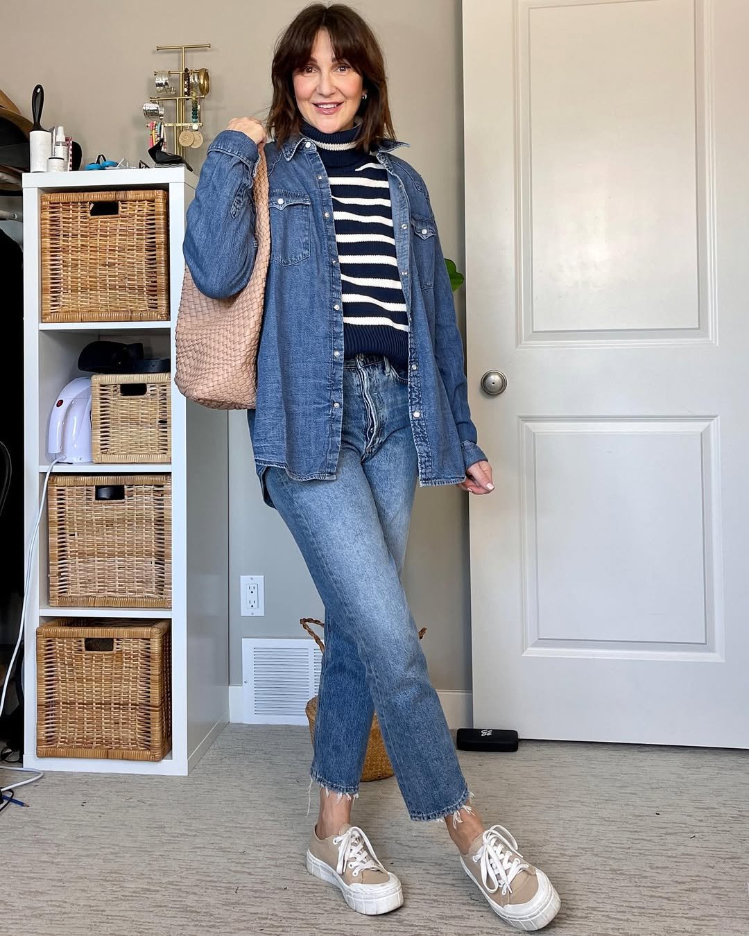 A striped knit under a denim button-down? Classic. But styled like this—with straight-leg jeans and neutral sneakers—it feels fresh instead of predictable. The woven tote adds texture and that laid-back, “I have errands but make it chic” vibe.
