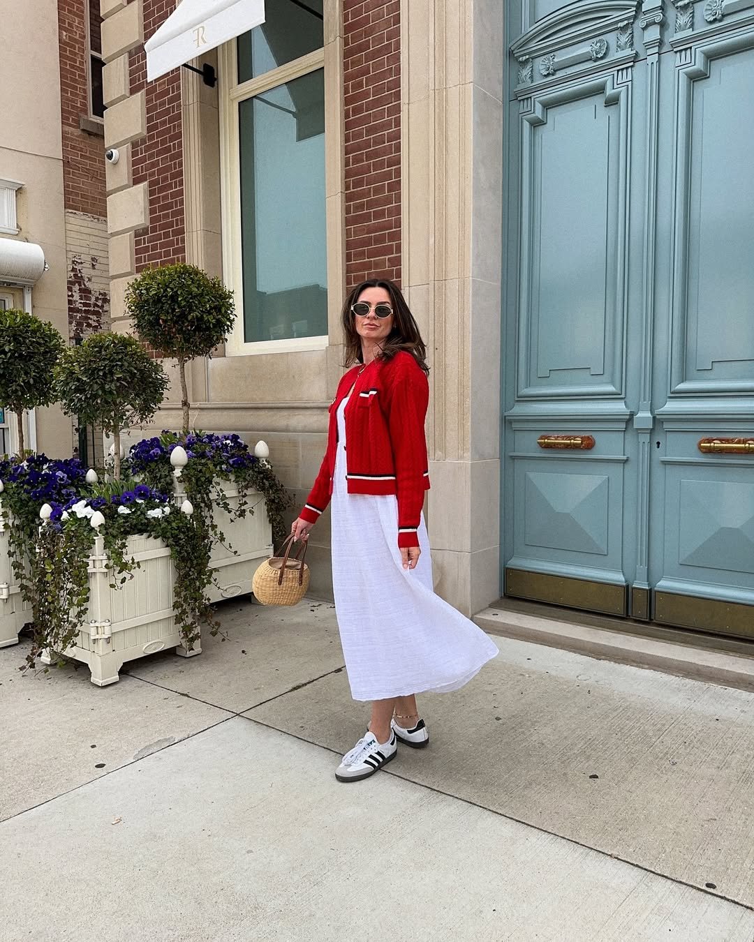 A bright red cardigan over a breezy white midi skirt is such a playful nod to Parisian spring. The stripes, the sneakers, the woven bag, it all feels polished but still totally wearable.
