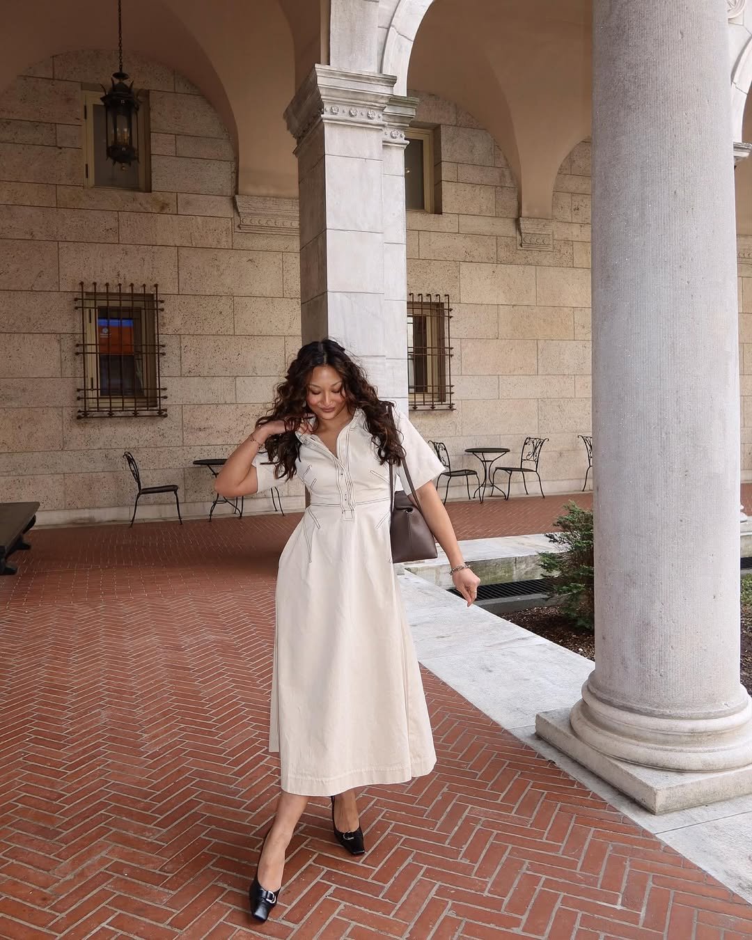 This beige shirt dress moment is quiet luxury in motion. The tailored fit, midi length, and classic black flats make it feel polished without losing that everyday wearability. It’s giving European stroll under archways energy.