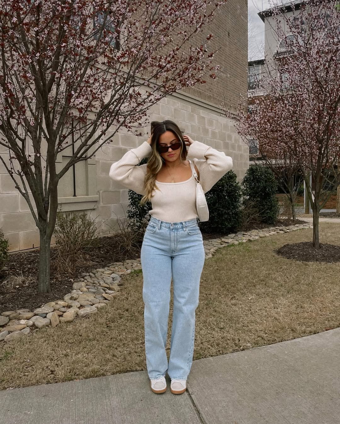 A soft beige knit with classic blue jeans just feels right when the weather can’t decide what it’s doing. The fitted silhouette balances the relaxed denim, and the mini shoulder bag keeps it fresh.