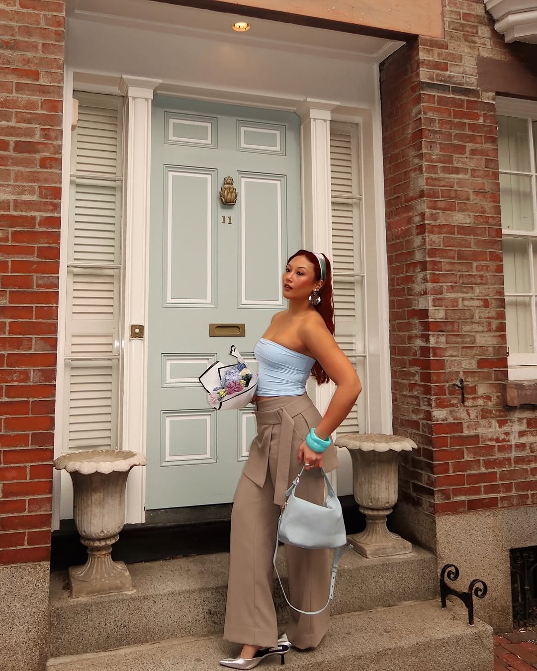 A baby-blue strapless top with tailored wide-leg trousers? Yes, please. This look balances softness and structure so well—it’s feminine but with that cool-girl edge. The matching accessories and sleek styling tie it all together without trying too hard.