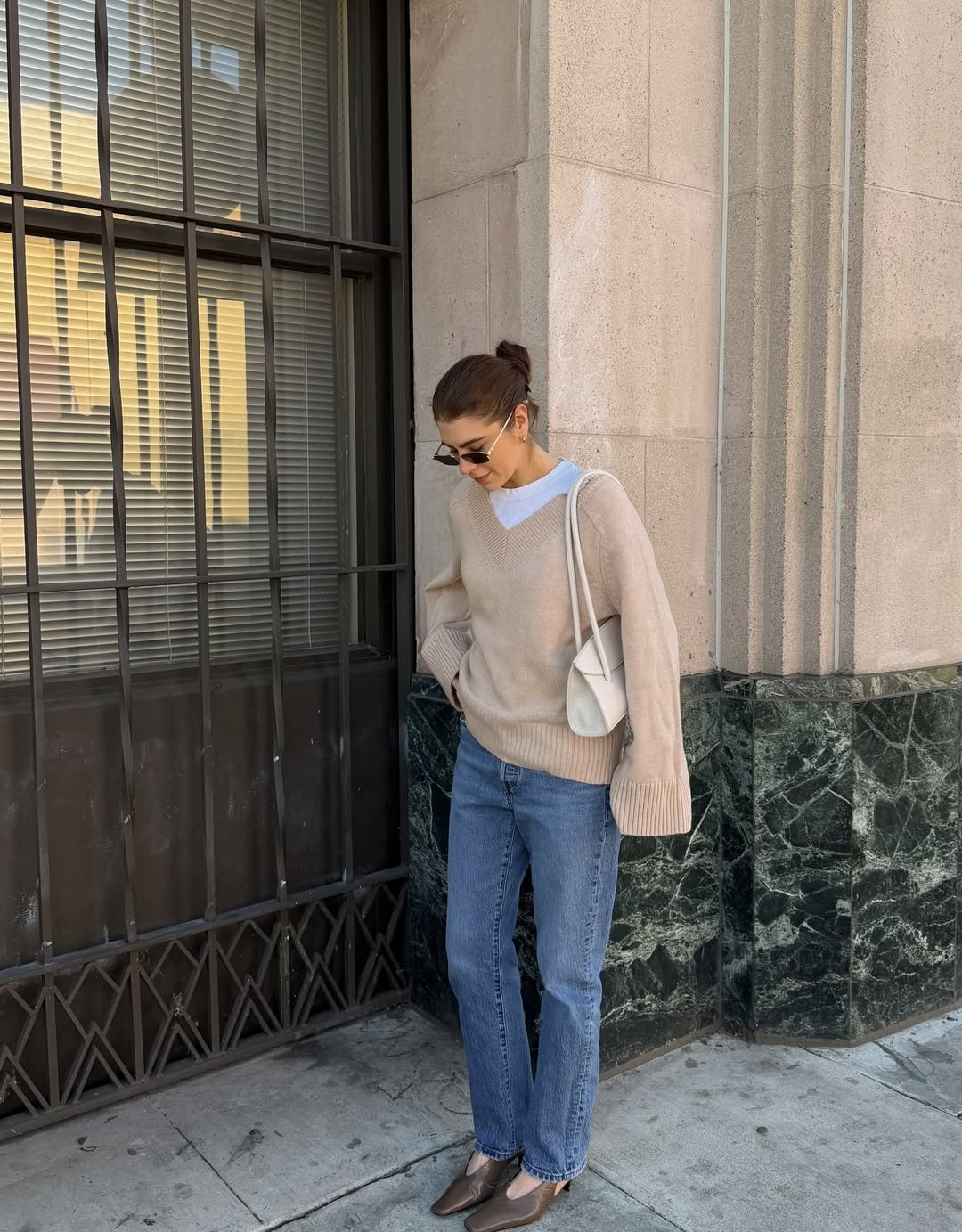 There’s something about this creamy knit layered over a white tee that feels quietly luxurious. Paired with classic straight-leg denim and sleek brown flats, it’s minimal—but not boring. It’s clean, thoughtful, and very grown.