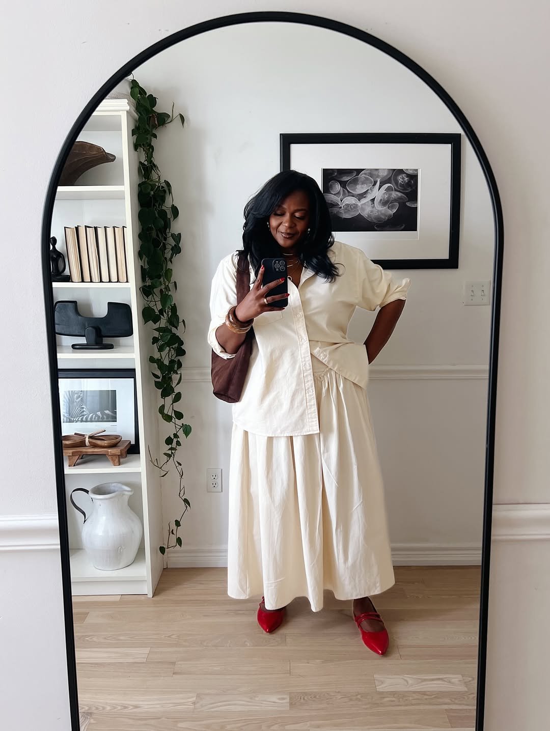 Head-to-toe cream in spring just feels fresh. The oversized button-down with a full skirt creates movement, while the bold red flats add a little spark.
