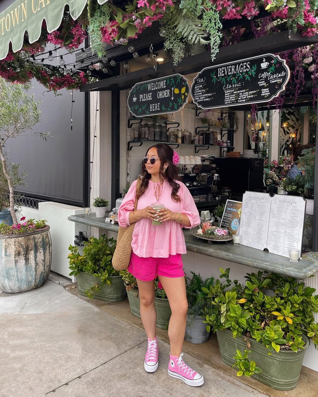 A soft pink blouse paired with bright shorts feels playful in the most charming way. Set against a flower-filled café backdrop, the whole look leans into color without losing its balance.