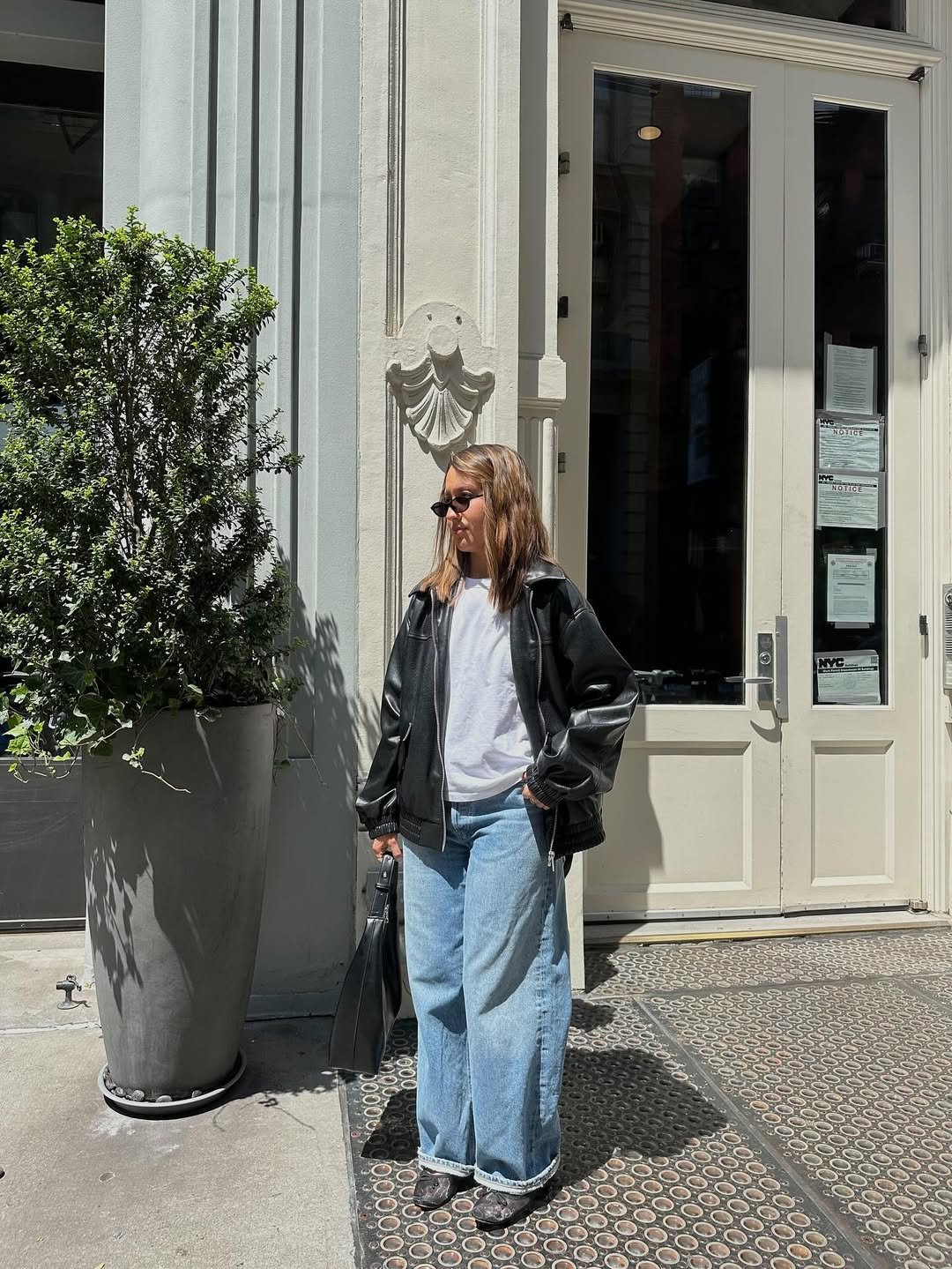 An oversized leather jacket layered over a crisp white tee and relaxed denim creates that effortless city uniform that never feels out of place. The silhouette leans into comfort, but the textures keep it sharp.