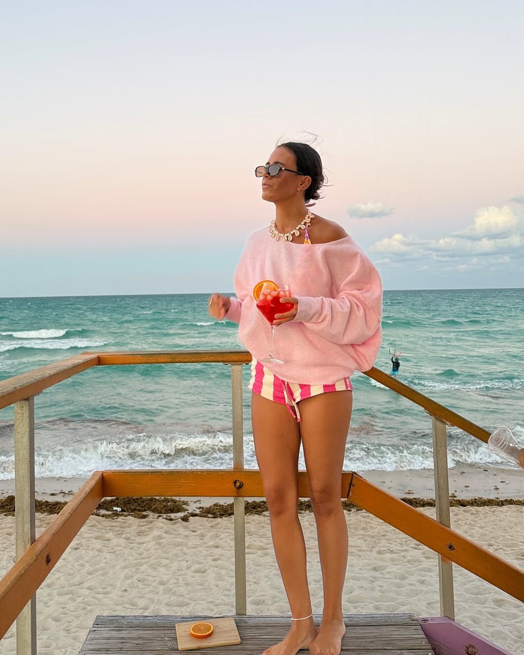 An oversized knit thrown over striped shorts feels like a quiet nod to seaside evenings when the breeze picks up. The soft pink tones echo the sky, while the shell necklace brings in that beachy detail without overdoing it.