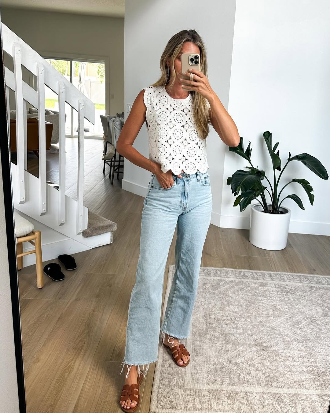 A delicate crochet tank tucked into light-wash denim brings that subtle handcrafted charm into everyday wear. The texture does all the talking, while the silhouette stays simple and grounded.